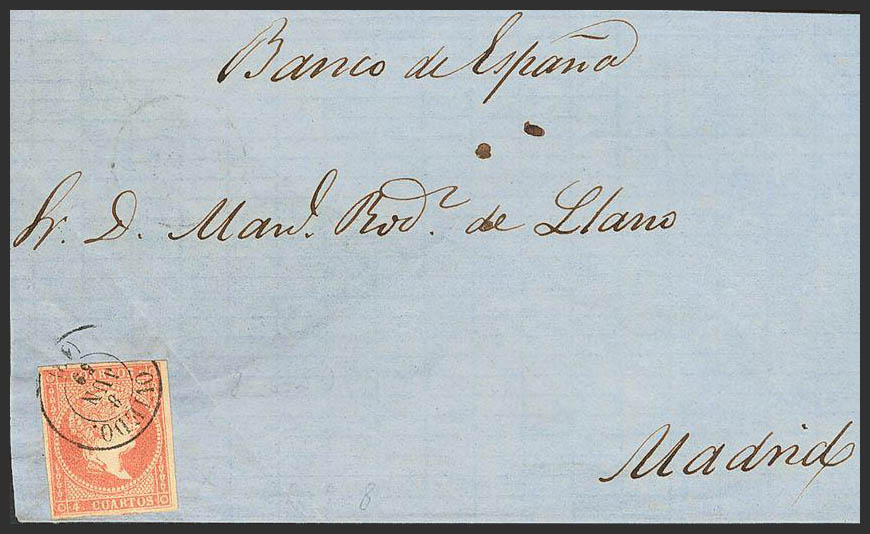 48. 1859. 4 cuartos rojo. OVIEDO a MADRID. Matasello OVIEDO / (18). MAGNIFICA.