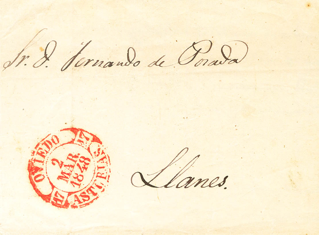 1848. OVIEDO a LLANES. Baeza OVIEDO / ASTURIAS, en rojo. MAGNIFICA.