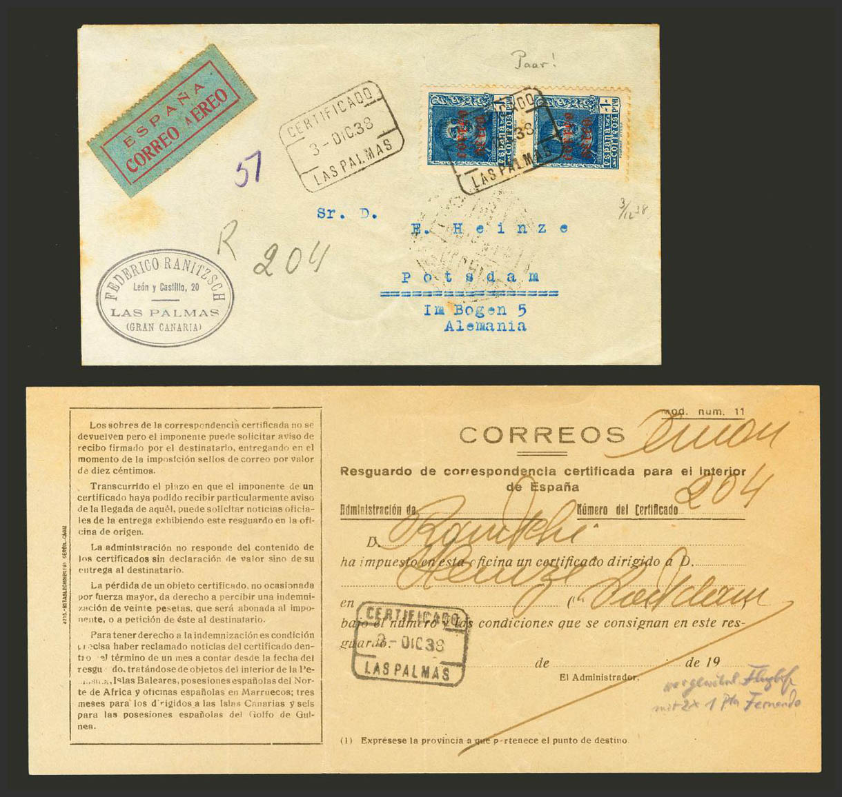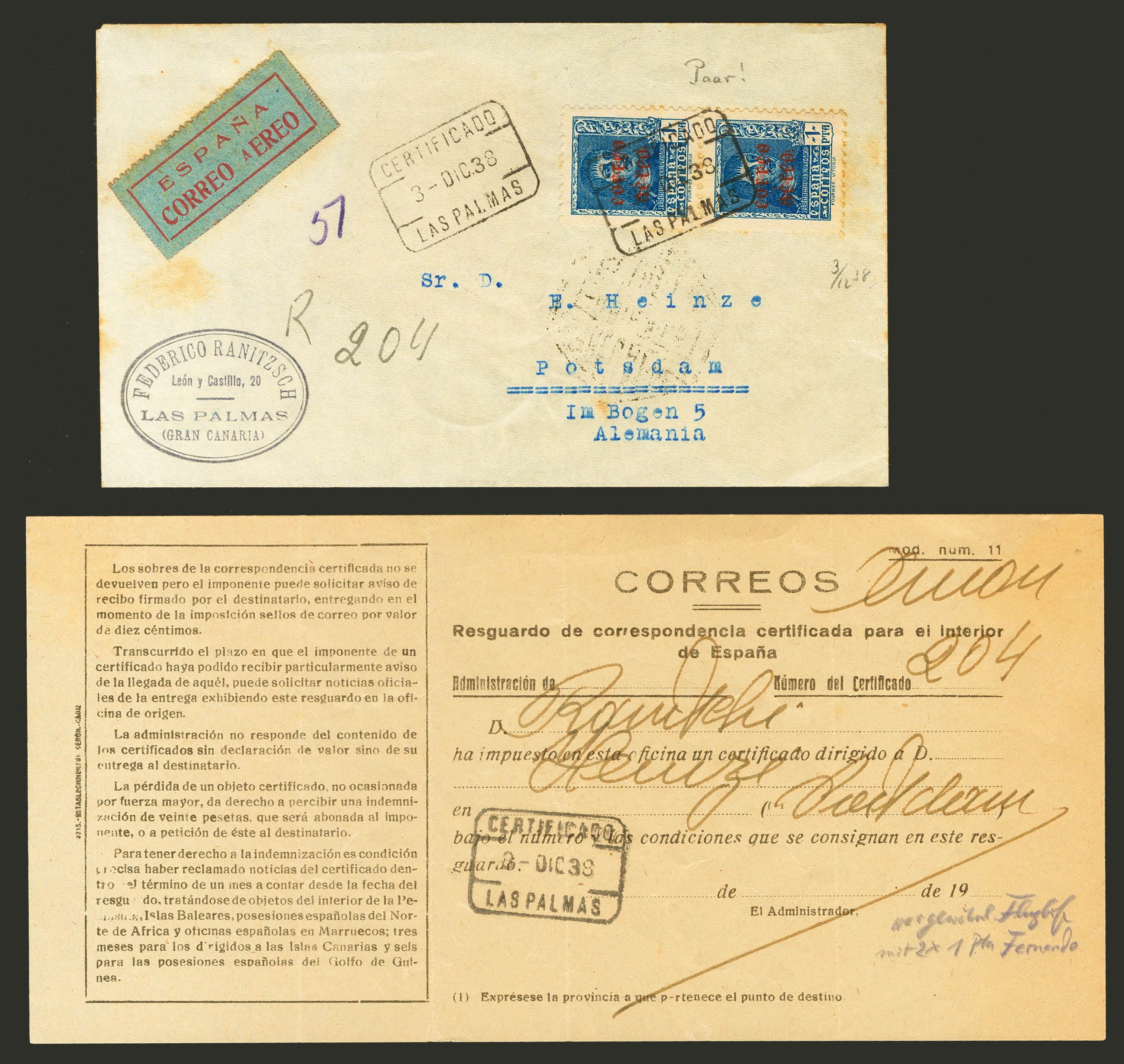 Canarias. Historia Postal. CERTIFICADO / LAS PALMAS, al dorso llegada (se incluye el resguardo). MAGNIFICA.