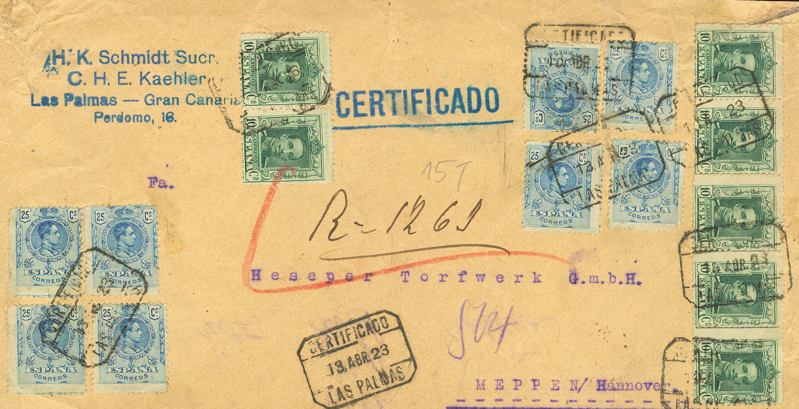 Canarias. Historia Postal. Frontal. CERTIFICADO / LAS PALMAS. MAGNIFICA.