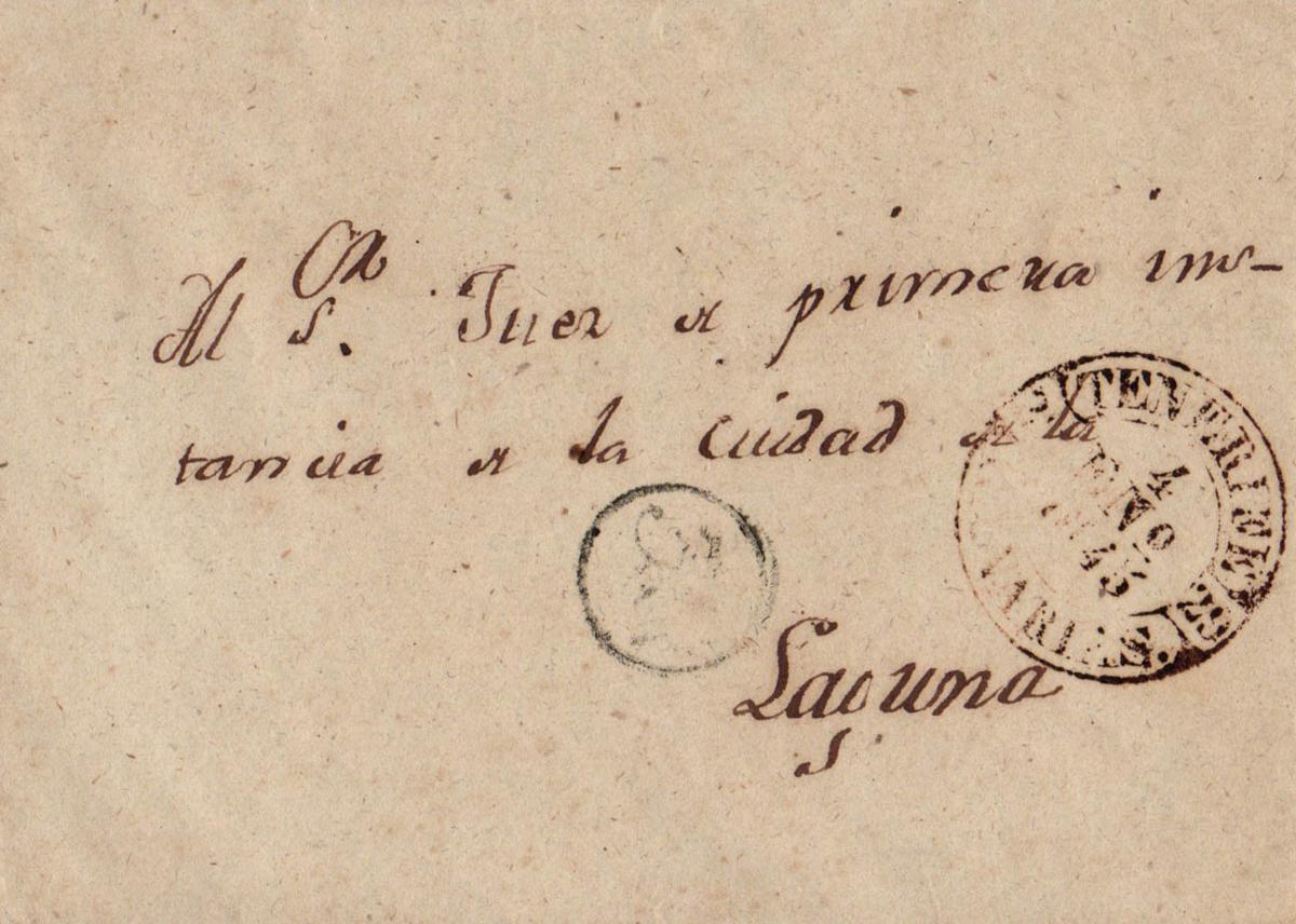 1845. SANTA CRUZ DE TENERIFE a LA LAGUNA. Baeza TENERIFE / CANARIAS, en marrón y marca de porte "3C". MAGNIFICA.