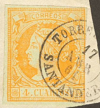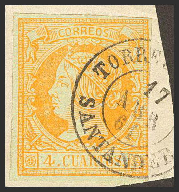 52. 1860. 4 cuartos amarillo. Matasello TORRELAVEGA / SANTANDER.