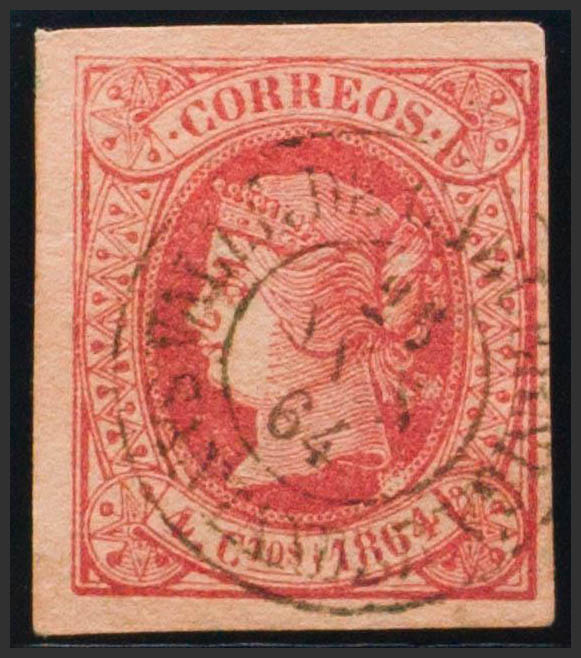 64. 1864. 4 cuartos rojo. Matasello VALLE DE CABUERNIGA / SANTANDER. MAGNIFICO Y RARO.