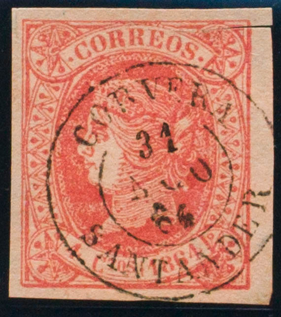 64. 1864. 4 cuartos rojo. Matasello CORVERA / SANTANDER. MAGNIFICO Y RARO.