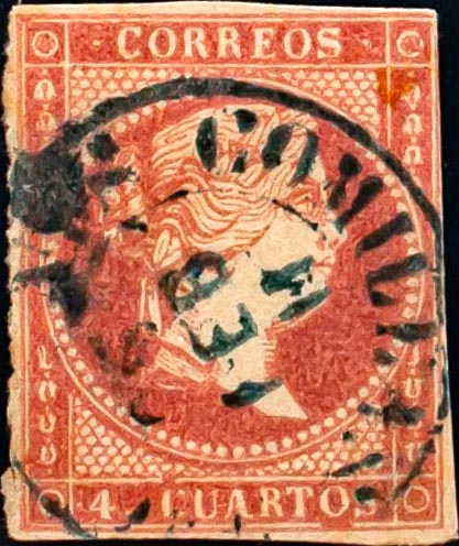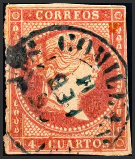 48. 1856. 4 cuartos rojo. Matasello COMILLAS / SANTANDER (Tipo I), en azul. MAGNIFICO.