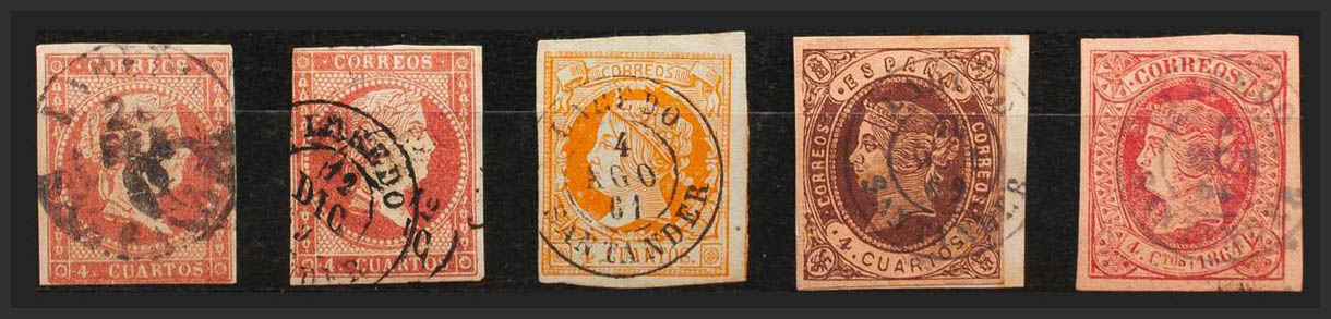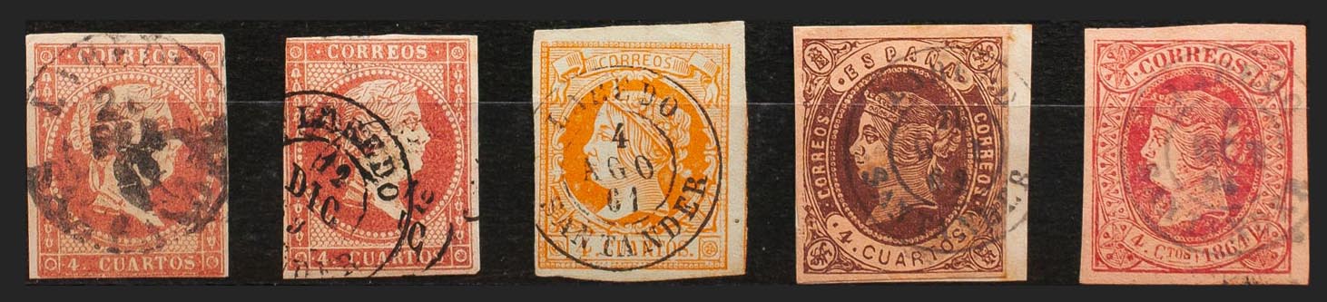 48(2), 52, 58, 64. (1855ca). Conjunto de cinco sellos del 4 cuartos rojo, amarillo, castaño y rosa, inutilizados con el matasello LAREDO / SANTANDER (incluyendo el Tipo I sobre el 4 cuartos rojo). MAGNIFICO.