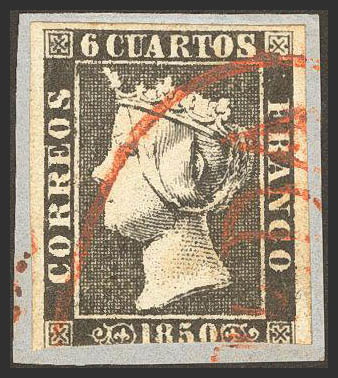 △ 1A. 1850. 6 cuartos negro, sobre fragmento. Matasello prefilatélico ONTANEDA. MAGNIFICO Y RARO.