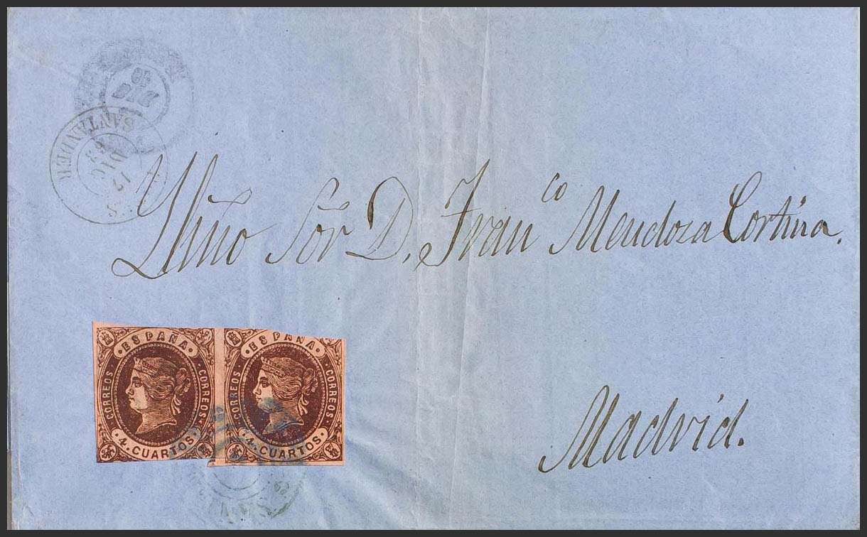 58(2). 1863. 4 cuartos castaño, pareja. POTES (SANTANDER) a MADRID. Matasello prefilatélico POTES / SANTANDER, en azul. MAGNIFICA Y EXTRAORDINARIAMENTE RARA EN ESTA EMISION, PODRIA TRATARSE DE LA UNICA CONOCIDA.
