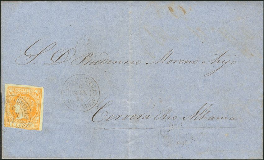 52. 1860. 4 cuartos amarillo. CASTRO-URDIALES a CERVERA RIO ALHAMA. Matasello CASTRO-URDIALES / SANTANDER.