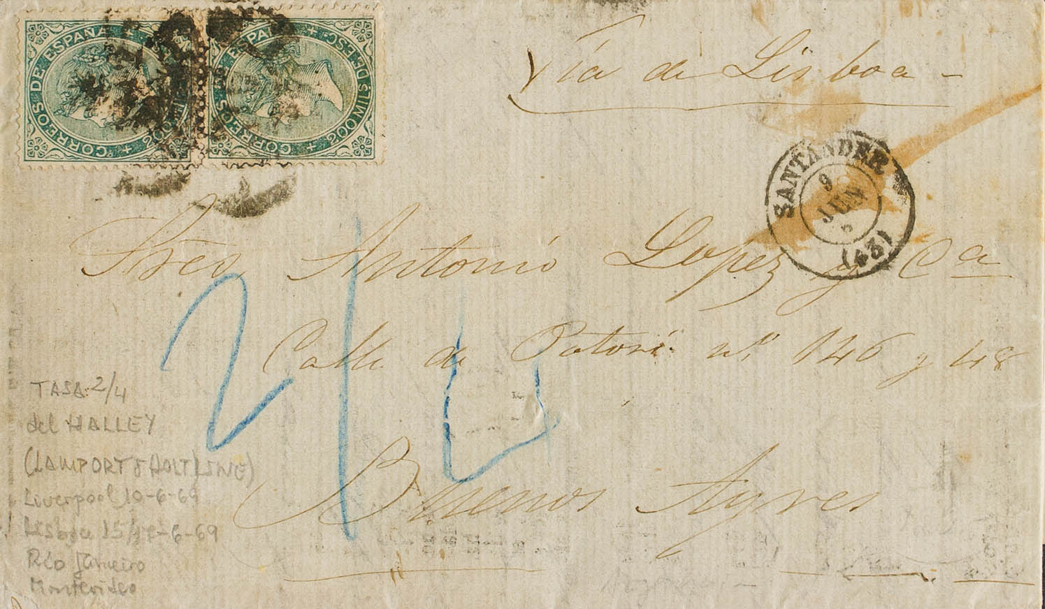 100(2). 1869. 200 mils verde, dos sellos. SANTANDER a BUENOS AIRES (ARGENTINA). Circulada por la vía de Lisboa pero franqueada como vía Inglesa, por lo que sobran 50 mils. MAGNIFICA Y RARA.