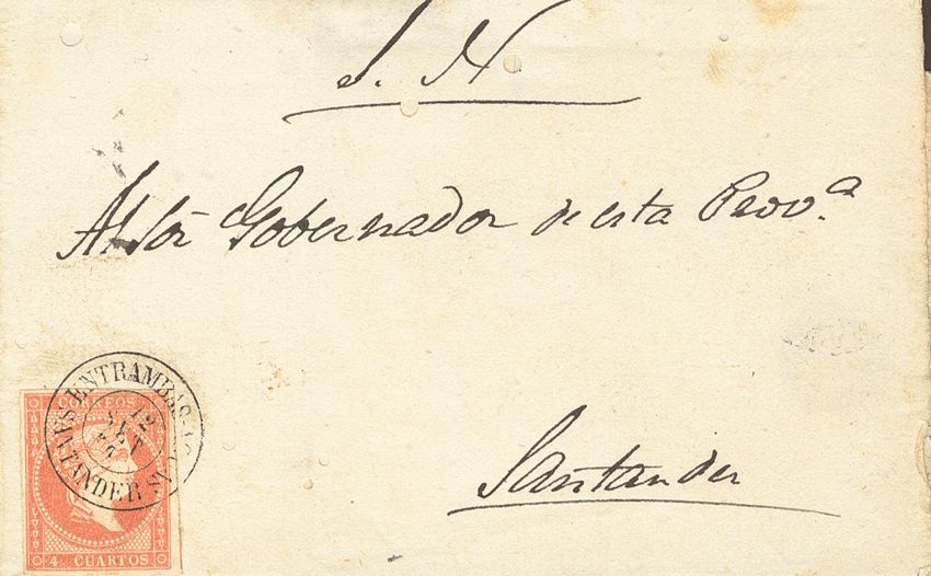 48. 1856. 4 cuartos rojo. ENTRAMBAS-AGUAS a SANTANDER. Matasello ENTRAMBAS-AGUAS / SANTANDER. RARA Y MAGNIFICA.