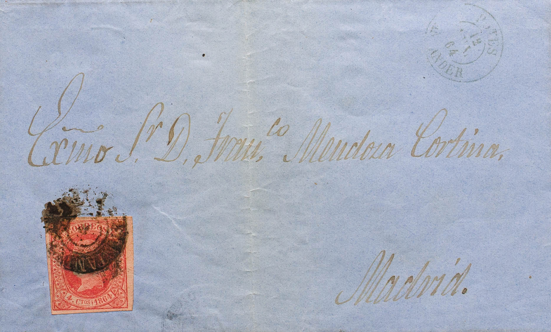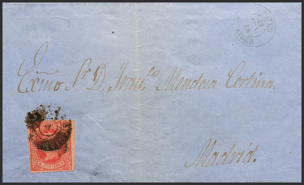 64. 1864. 4 cuartos rojo. POTES a MADRID. Matasello prefilatélico SANTANDER / POTES. MAGNIFICA Y MUY RARA.
