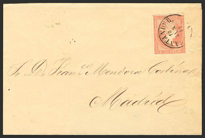 48. 1856. 4 cuartos rojo. SANTANDER a MADRID. Matasello SANTANDER / (43). MAGNIFICA.