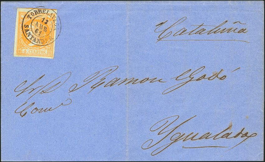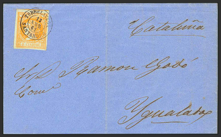 52. 1861. 4 cuartos amarillo. TORRELAVEGA a IGUALADA. Matasello TORRELAVEGA / SANTANDER. MAGNIFICA.