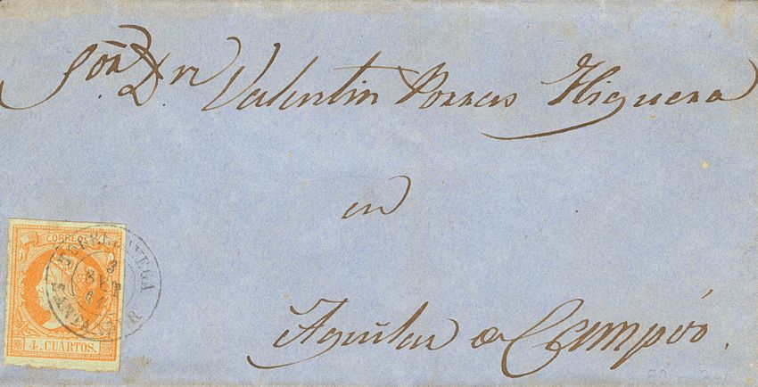52. 1861. 4 cuartos amarillo. TORRELAVEGA a AGUILAR. Matasello TORRELAVEGA / SANTANDER. MAGNIFICA.