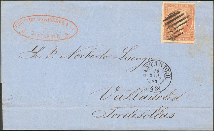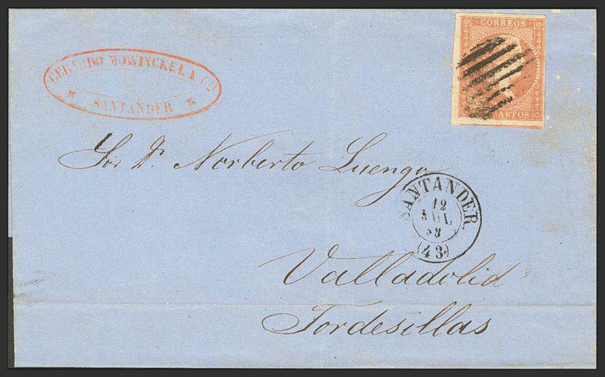 48. 1858. 4 cuartos rojo. SANTANDER a TORDESILLAS. Matasello PARRILLA, al lado SANTANDER / (43). MAGNIFICA.