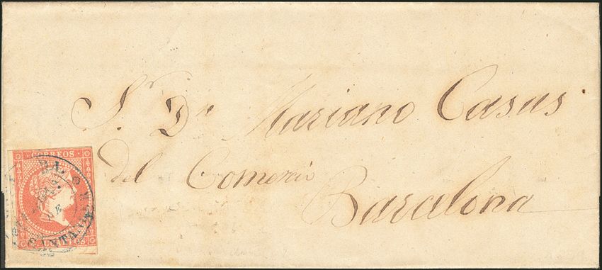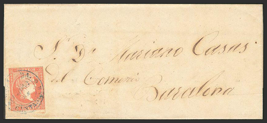 48. 1859. 4 cuartos rojo. VEGA DE PAS a BARCELONA. Matasello prefilatélico ONTANEDA / PROV. DE / SANTANDER, en azul.