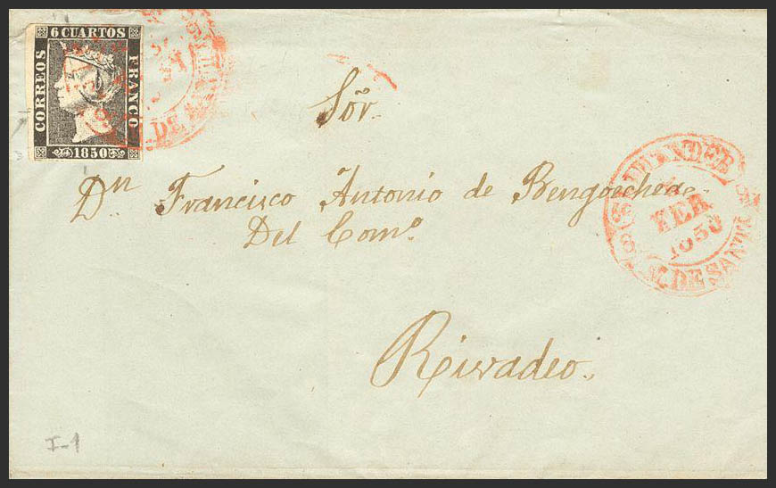 1. 1850. 6 cuartos negro. SANTANDER a RIVADEO. Matasello baeza SANTANDER / M. DE SANTR. BONITA.