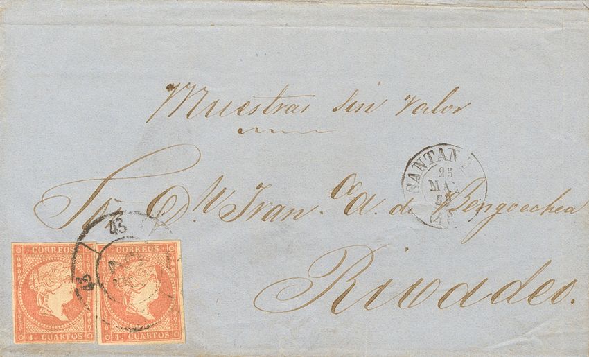 48(2). 1859. 4 cuartos rojo, dos sellos. SANTANDER a RIVADEO. Matasello R. CARRETA Nº43, manuscrito "Muestras sin valor". MAGNIFICA.
