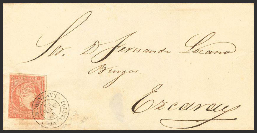48. 1859. 4 cuartos rojo. TORRELAVEGA a EZCARAY. Matasello TORRELAVEGA / SANTANDER. MAGNIFICA.