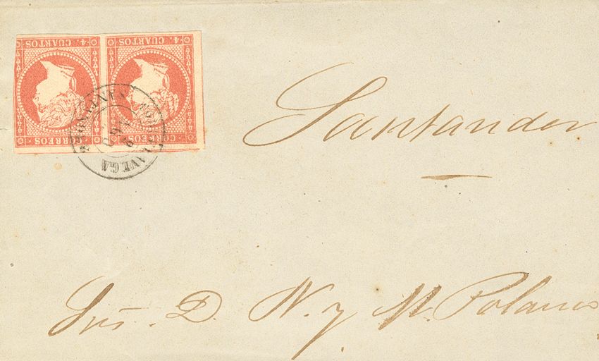 48(2). 1856. 4 cuartos rojo, pareja. Matasello TORRELAVEGA / SANTANDER. MAGNIFICA.