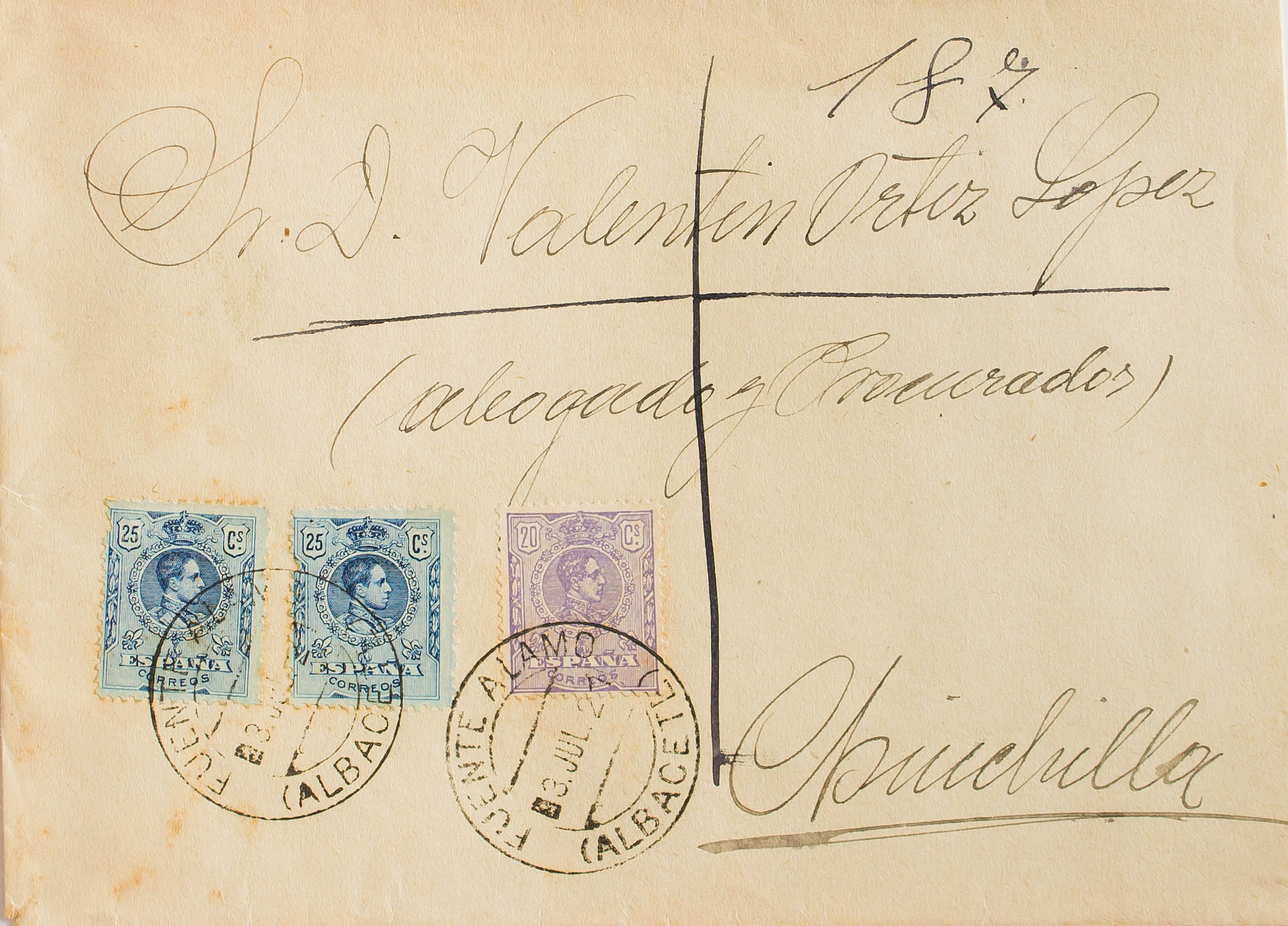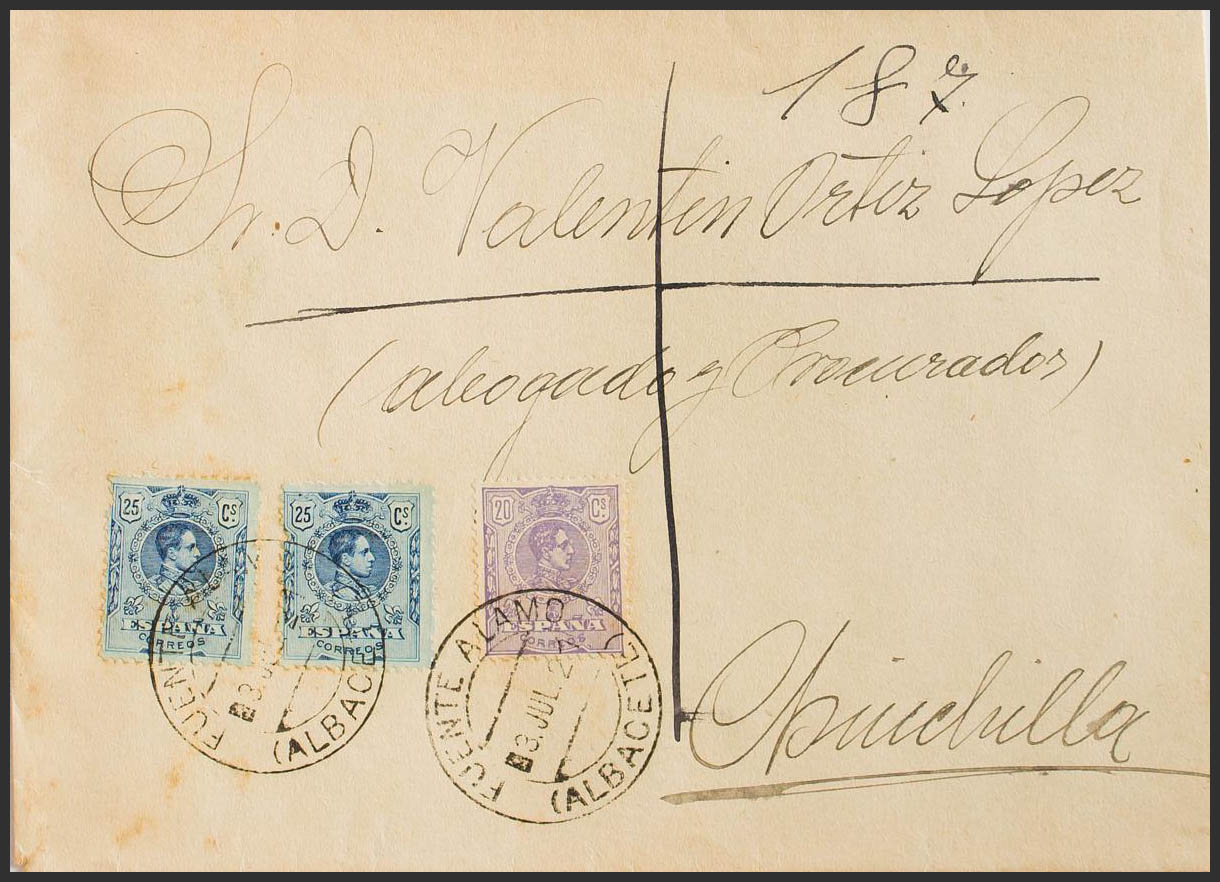 290, 274(2). 1921. 20 cts violeta LITOGRAFIADO y 25 cts azul, dos sellos. FUENTE ALAMO a CHINCHILLA. Matasello FUENTE ALAMO / ALBACETE, al dorso llegada. MAGNIFICA Y RARA.