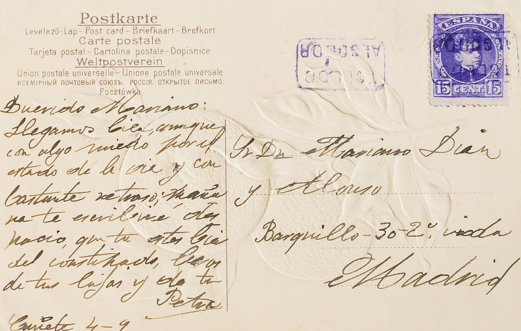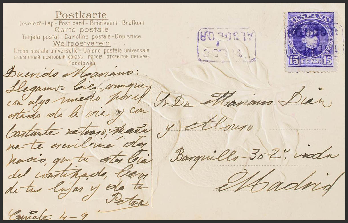 245. (1905ca). 15 cts violeta. Tarjeta de ALGODOR a MADRID. Matasello carterÃa TOLEDO / ALGODOR, en violeta. MAGNIFICA.