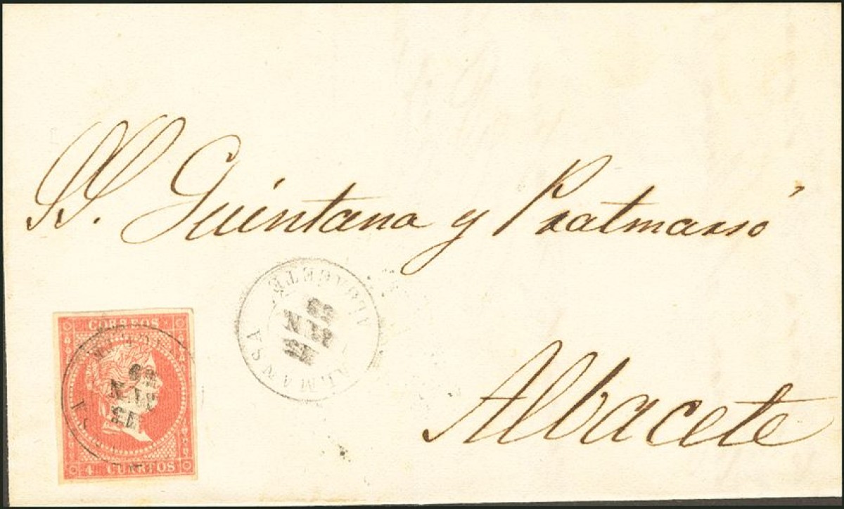 48. 1859. 4 cuartos rojo. ALMANSA a ALBACETE. Matasello ALMANSA / ALBACETE. POCO LEGIBLE.