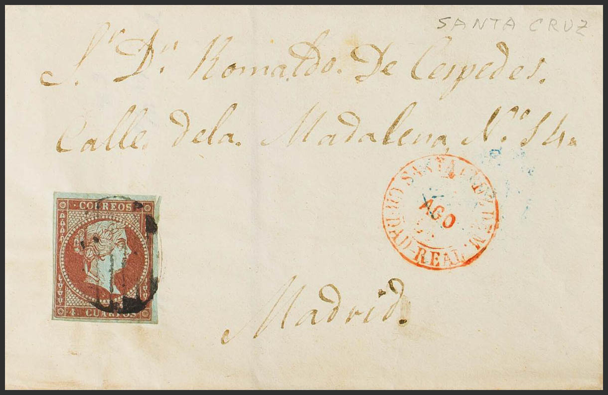 40. 1855. 4 cuartos rojo. SANTA CRUZ DE MUDELA a MADRID. En el frente fechador SANTA CRUZ DE M. / CIUDAD-REAL, en rojo. MAGNIFICA.