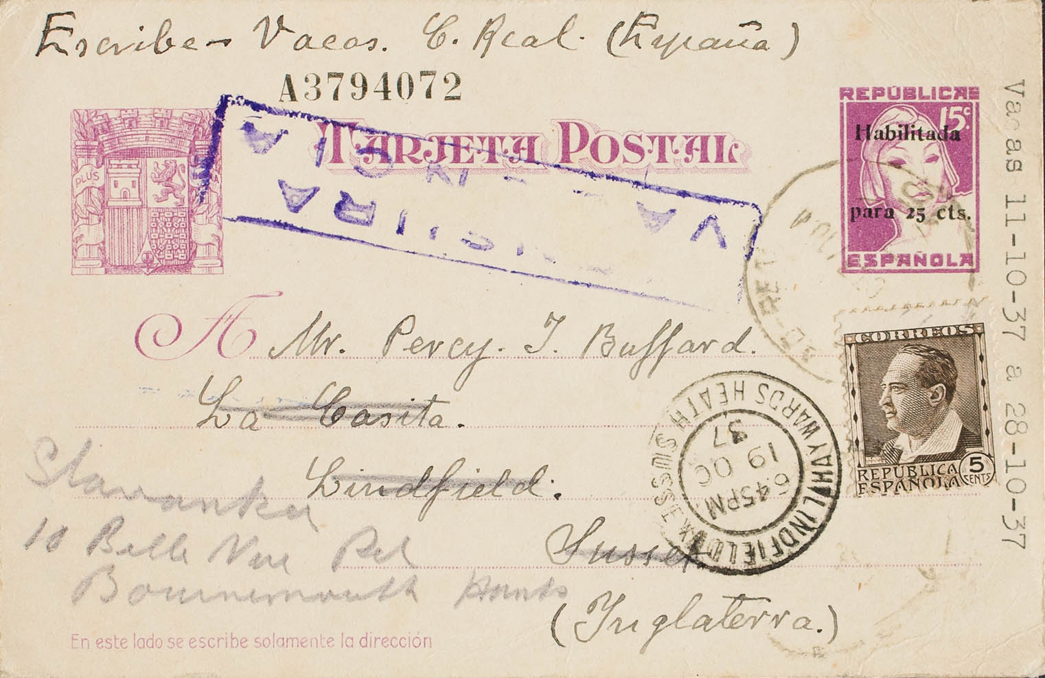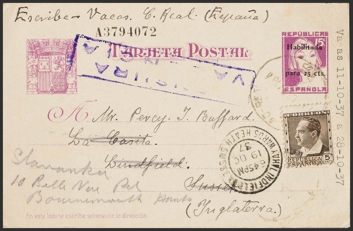 EP76. 1937. 25 cts sobre 15 cts lila sobre Tarjeta Entero Postal de CIUDAD REAL a LINDFIELD (INGLATERRA), reexpedida a BOMNERMOUTH, con franqueo complementario de 5 cts castaño negro. En el frente llegada. MAGNIFICA.