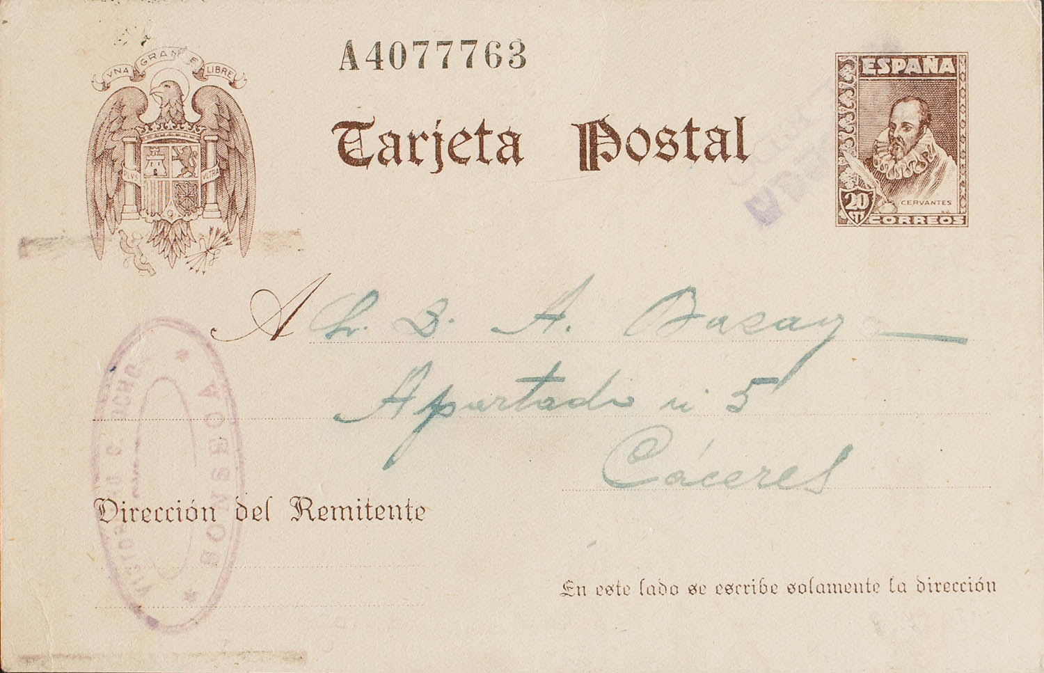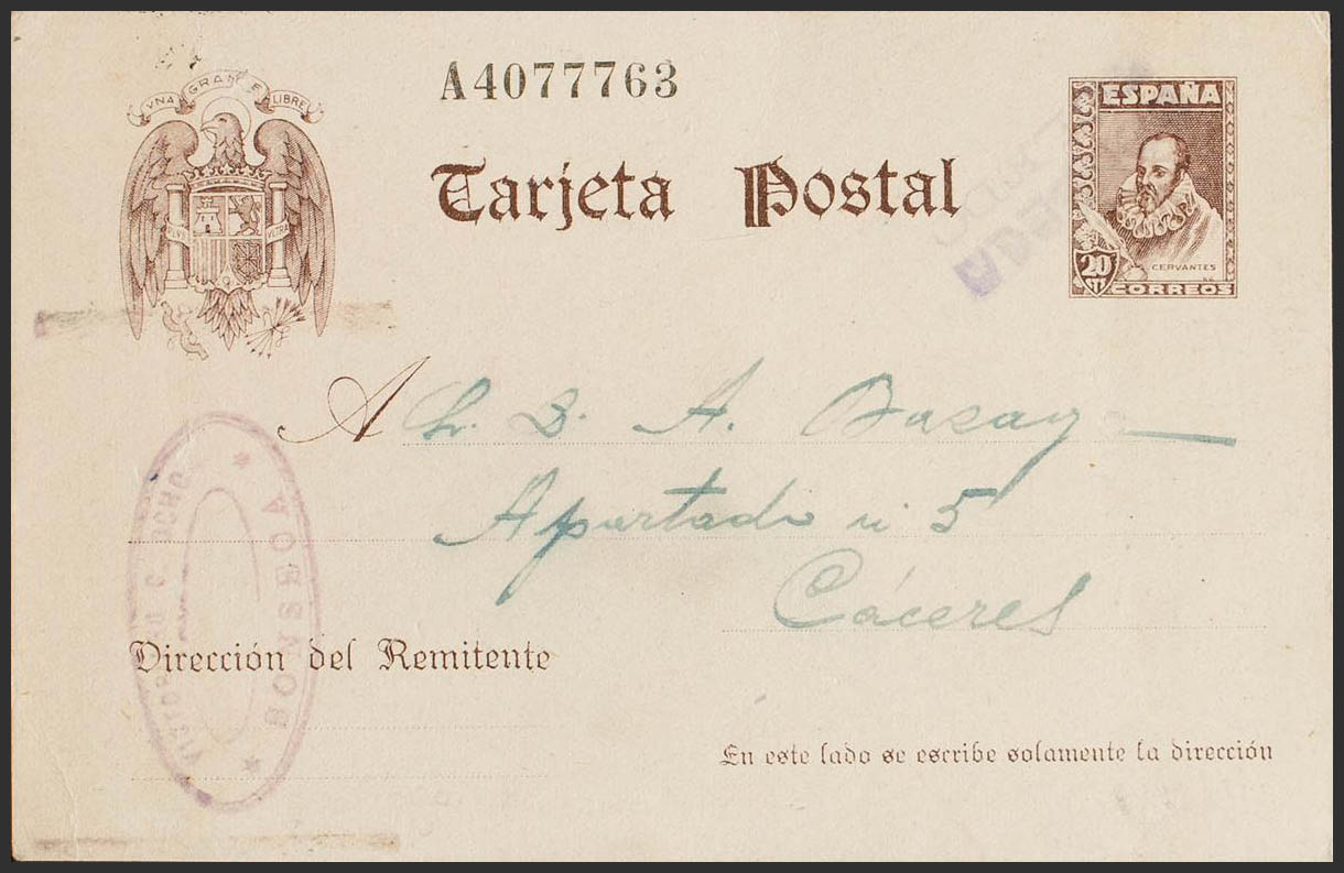 EP83. 1940. 20 cts castaño sobre Tarjeta Entero Postal de SONSECA a CACERES. Matasello especial SONSECA / TOLEDO, en violeta. MAGNIFICA.