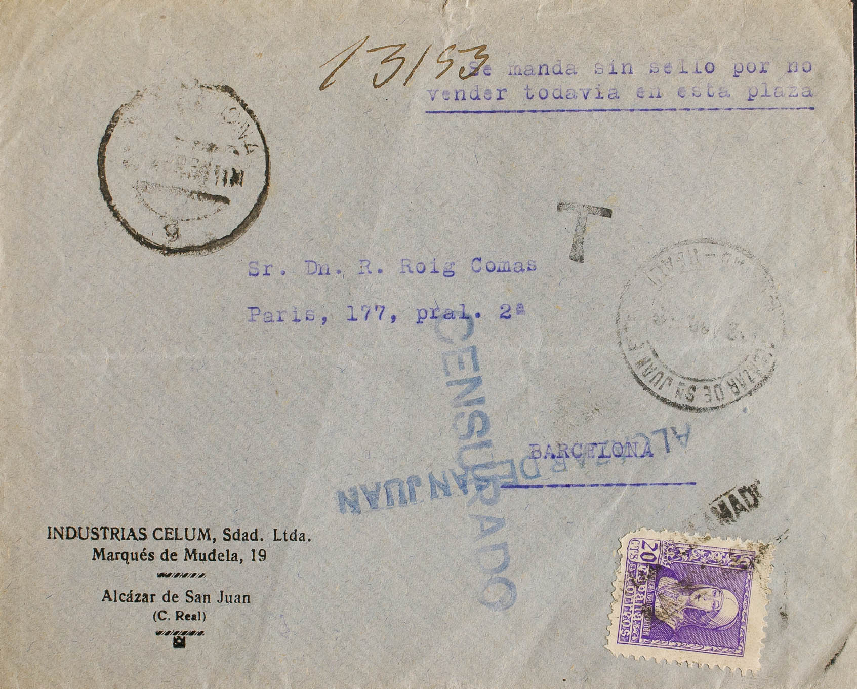 855. 1938. 20 cts violeta. ALCAZAR DE SAN JUAN a BARCELONA. En el frente texto mecanografiado "Se manda sin sello por no vender todavÃa en esta plaza", la carta es tasada a la llegada aplicando el sello de 20 cts en Barcelona y reclamando dicho franqueo. MAGNIFICA Y RARA.