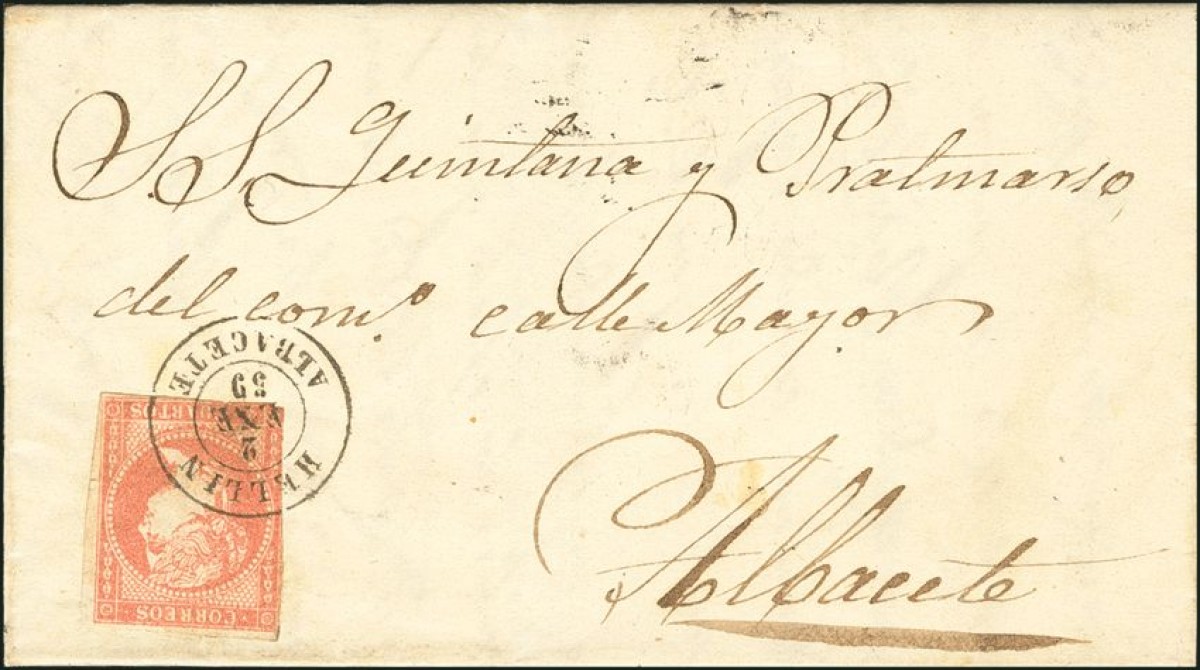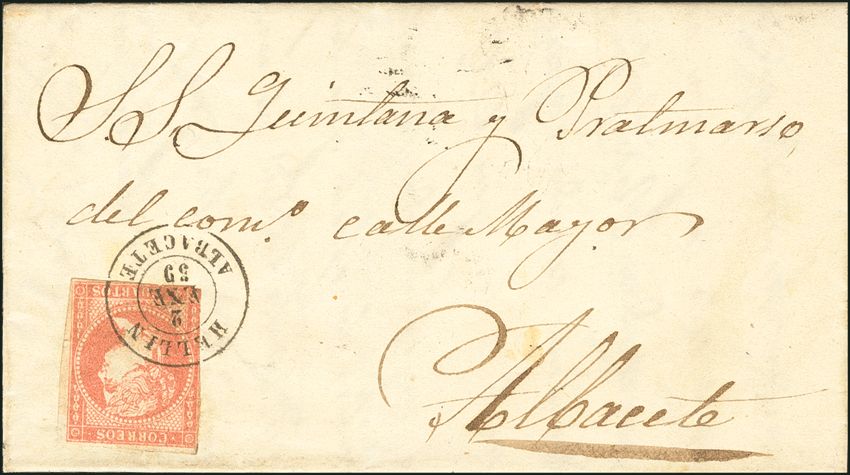 48. 1856. 4 cuartos rojo. HELLIN a ALBACETE. Matasello HELLIN / ALBACETE. MAGNIFICA.