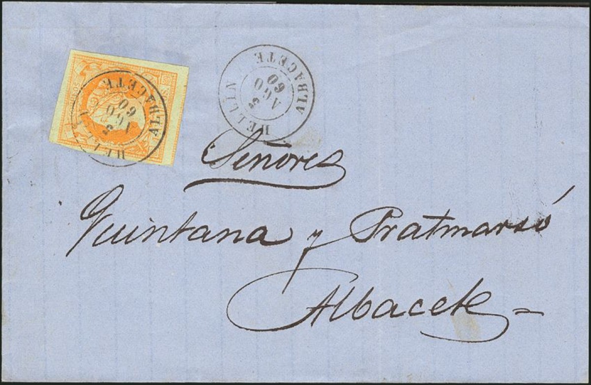 52. 1860. 4 cuartos amarillo. HELLIN a ALBACETE. Matasello HELLIN / ALBACETE. MAGNIFICA.