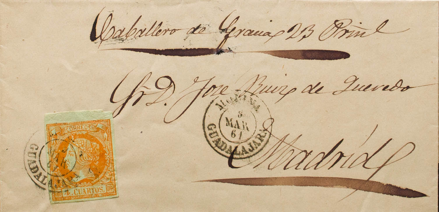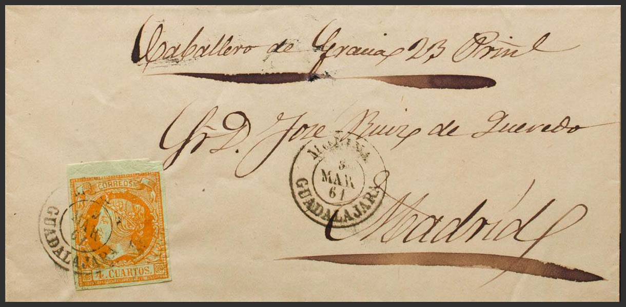 52. 1861. 4 cuartos naranja. MOLINA a MADRID. Matasello MOLINA / GUADALAJARA. MAGNIFICA.