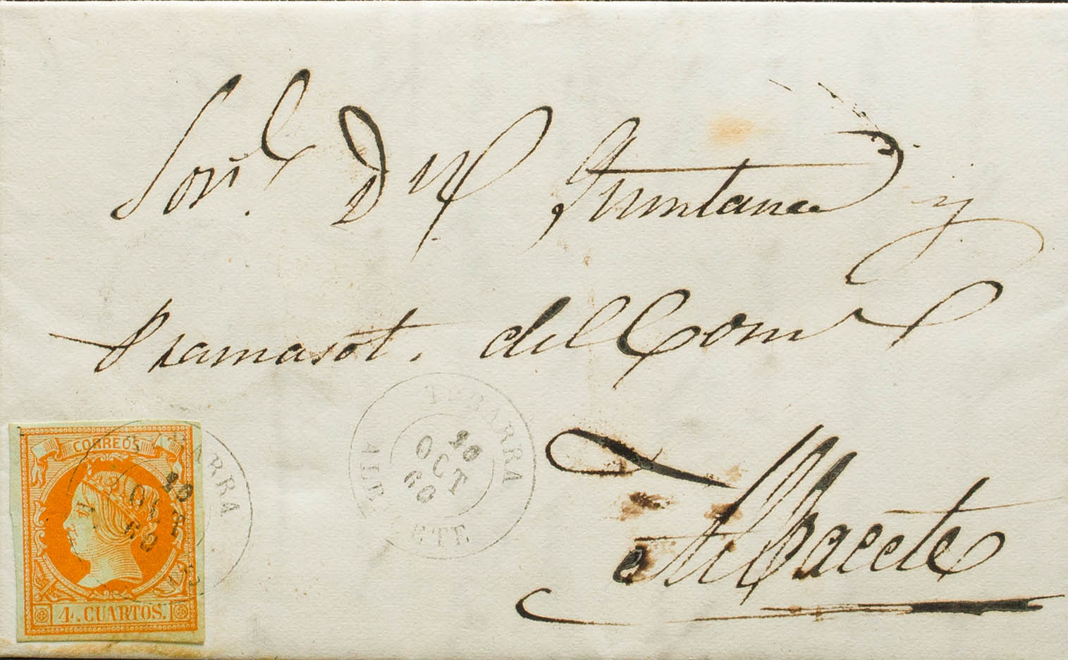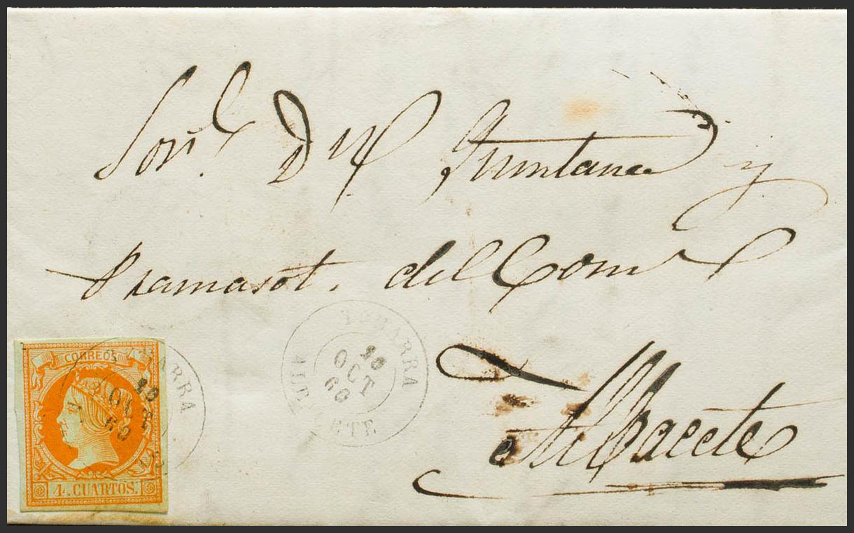 52. 1860. 4 cuartos naranja. TOBARRA a ALBACETE. Matasello TOBARRA / ALBACETE. MAGNIFICA Y MUY RARA.