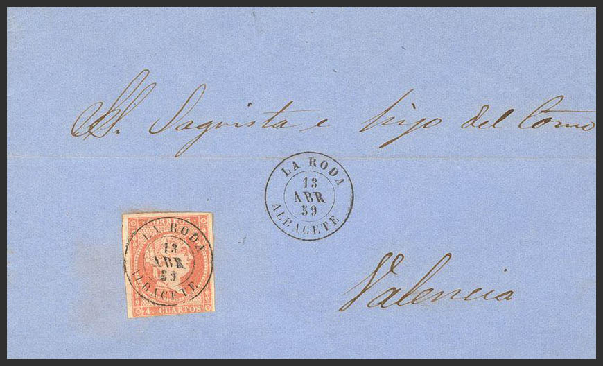 48. 1856. 4 cuartos rojo. LA RODA a VALENCIA. Matasello LA RODA / ALBACETE. MAGNIFICA.