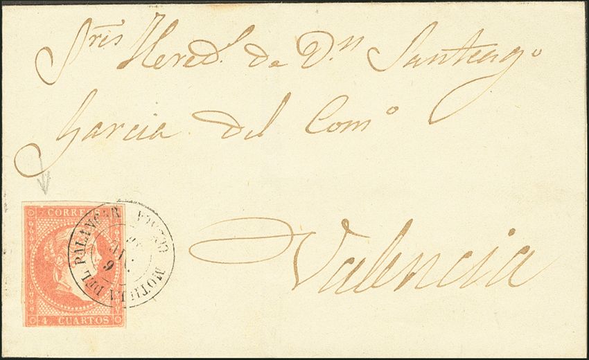 48. 1858. 4 cuartos rojo. MOTILLA DEL PALANCAR a VALENCIA. Matasello MOTILLA DEL PALANCAR / CUENCA. MAGNIFICA.