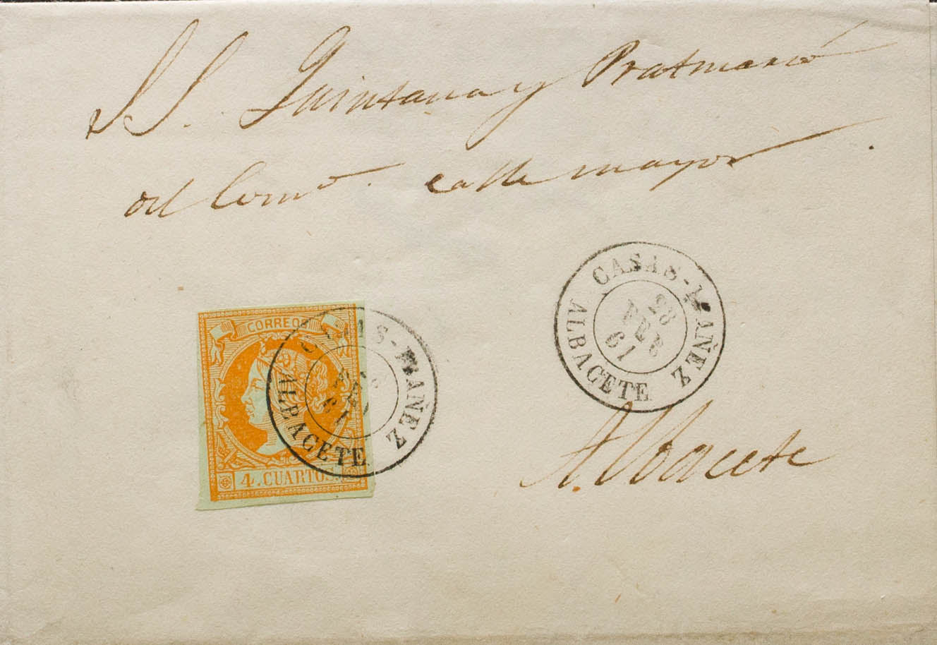 52. 1861. 4 cuartos naranja. CASAS DE IBAÑEZ a ALBACETE. Matasello CASAS-IBAÑEZ / ALBACETE. MAGNIFICA Y RARA.