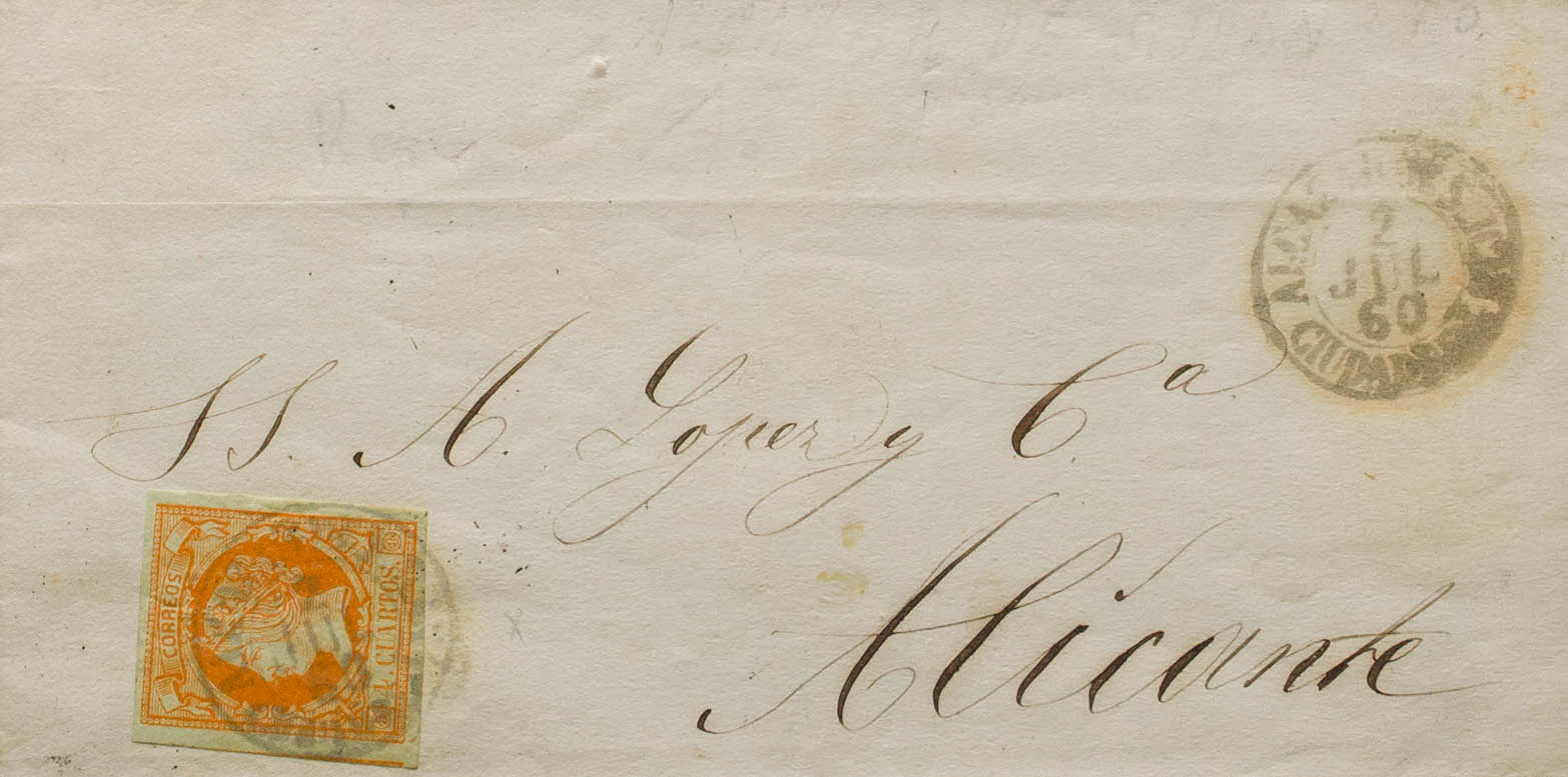 52. 1860. 4 cuartos naranja. ALCAZAR DE SAN JUAN a ALICANTE. Matasello ALCAZAR DE S.JUAN / CIUDAD-REAL (Tipo I), en azul-negro. MAGNIFICA Y RARA.