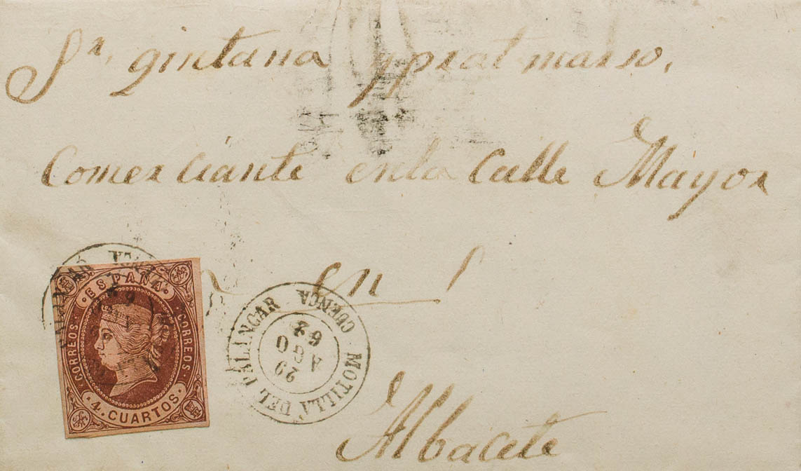 58. 1863. 4 cuartos castaño. LA JARA (CUENCA) a ALBACETE. Matasello MOTILLA DEL PALANCAR / CUENCA. MAGNIFICA Y RARA.