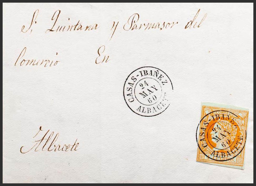52. 1860. 4 cuartos naranja. CASAS IBAÑEZ a ALBACETE. Matasello CASAS IBAÑEZ / ALBACETE. MAGNIFICA.