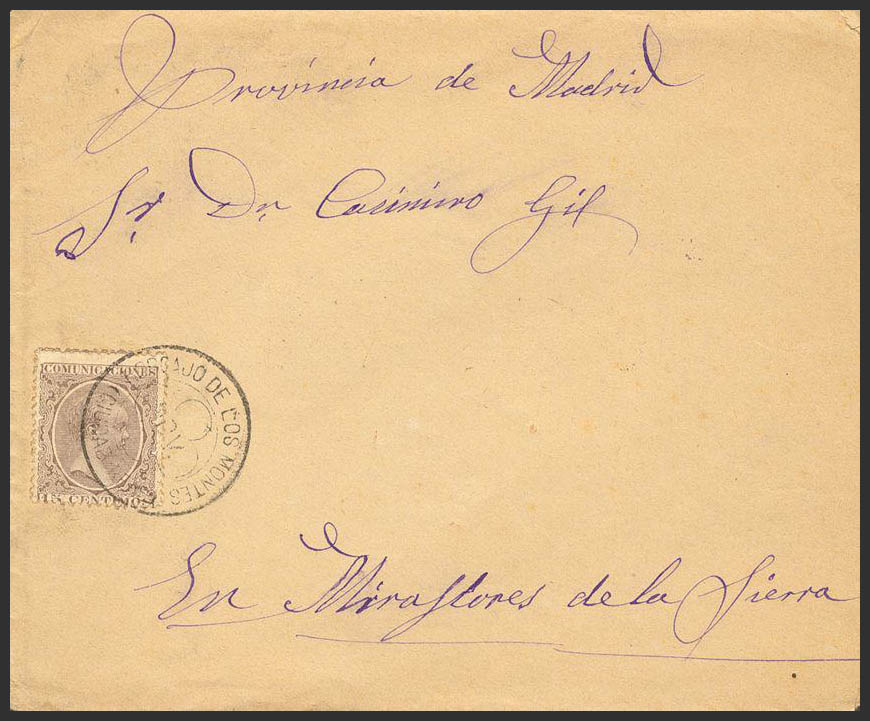 219. 1890. 15 cts castaño. HORCAJO a MIRAFLORES. Matasello trébol HORCAJO DE LOS MONTES / (CIUDAD-REAL). MAGNIFICA.