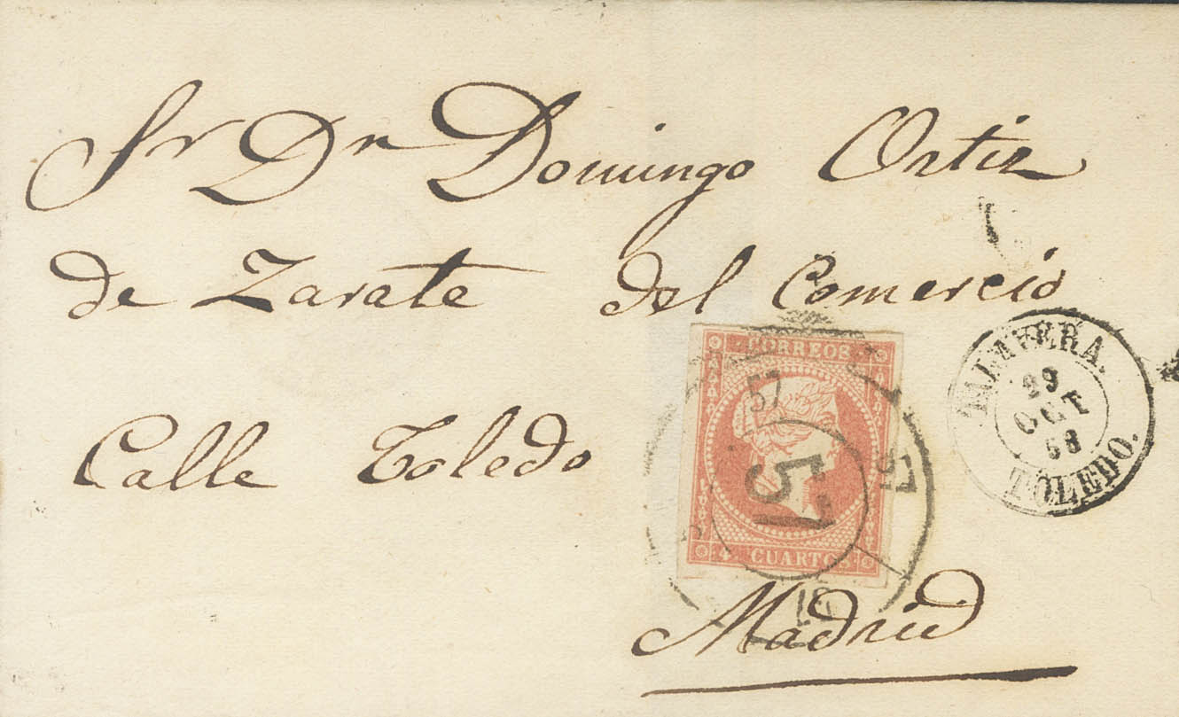 48. 1858. 4 cuartos rojo. TALAVERA a MADRID. Matasello R.CARRETA Nº57. MAGNIFICA Y ESPECTACULAR.