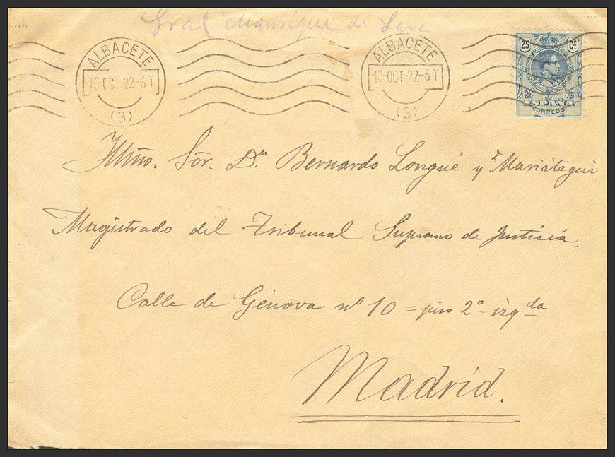 274. 1922. 25 cts. azul. ALBACETE A MADRID. Mataselo rodillo ALBACETE / (2). MAGNIFICA.