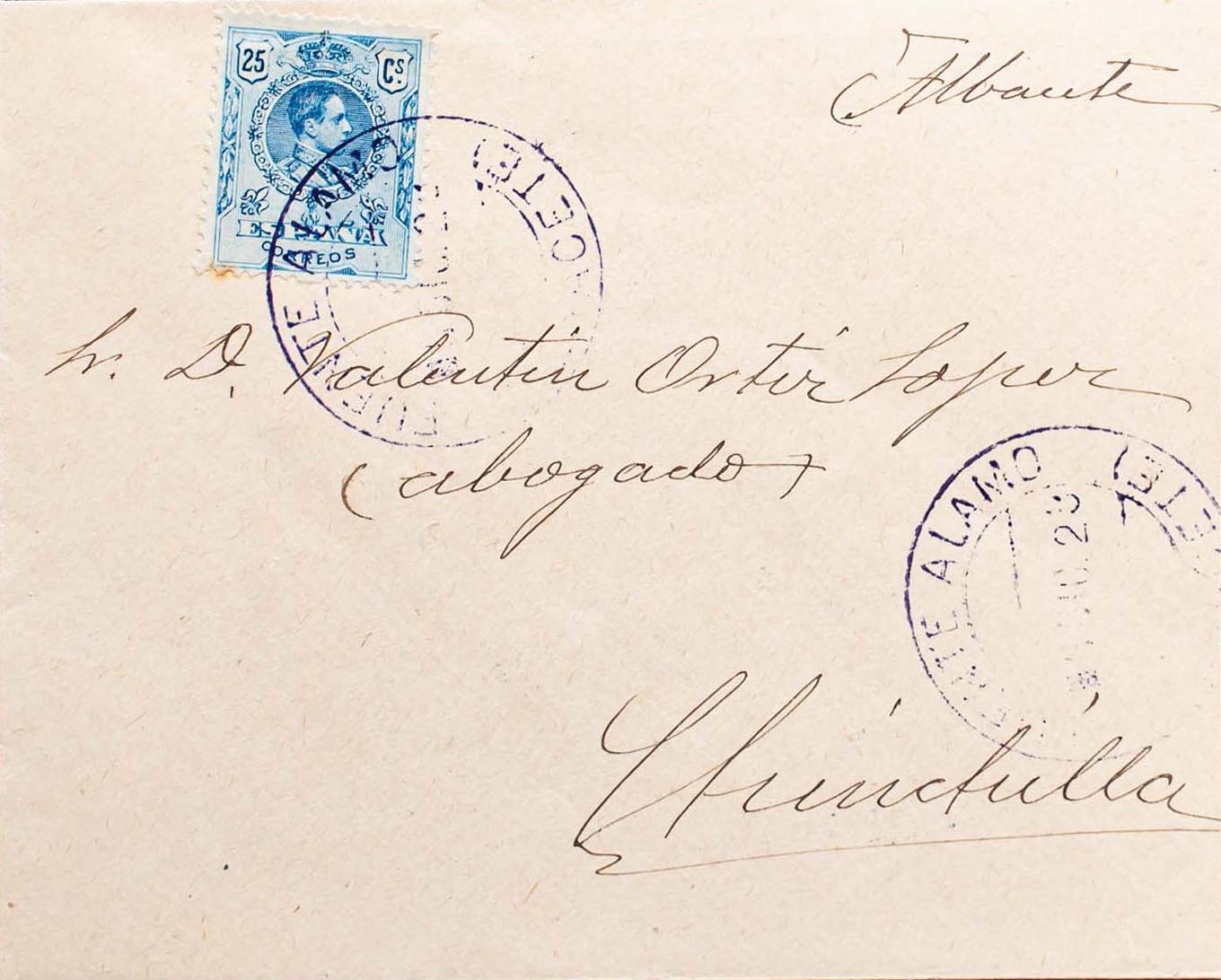 Castilla-La Mancha. Historia Postal. FUENTE ALAMO / (ALBACETE), en azul y al dorso tránsito. MAGNIFICA.