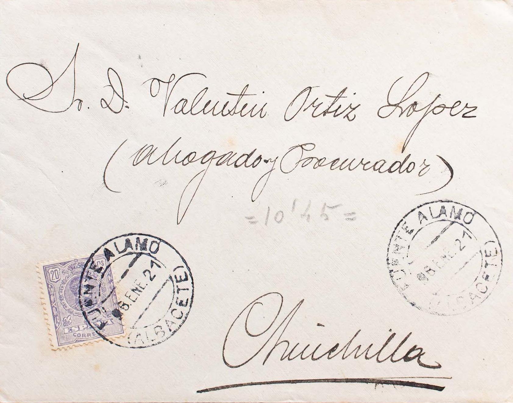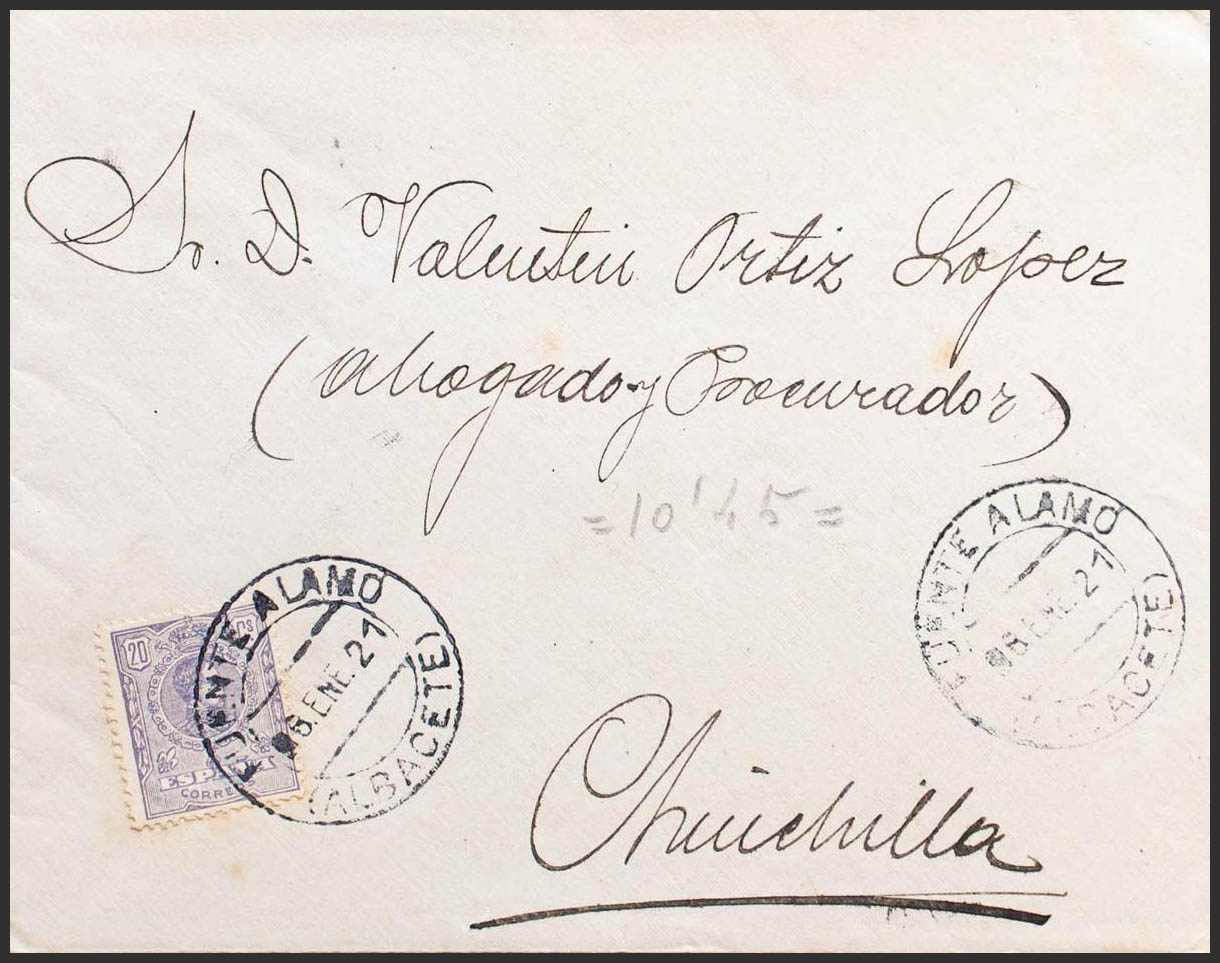 Castilla-La Mancha. Historia Postal. FUENTE ALAMO / (ALBACETE), al dorso llegada. MAGNIFICA.