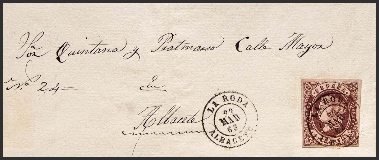 58. 1863. 4 cuartos castaño. LA RODA a ALBACETE. Matasello LA RODA / ALBACETE. MAGNIFICA.