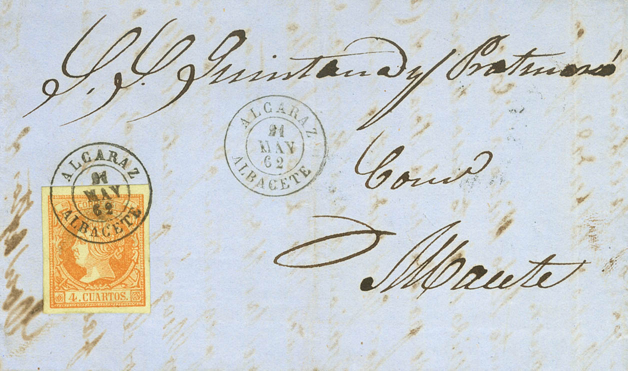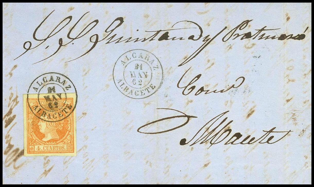 52. 1862. 4 cuartos naranja. ALCARAZ a ALBACETE. Matasello ALCARAZ / ALBACETE. MAGNIFICA.