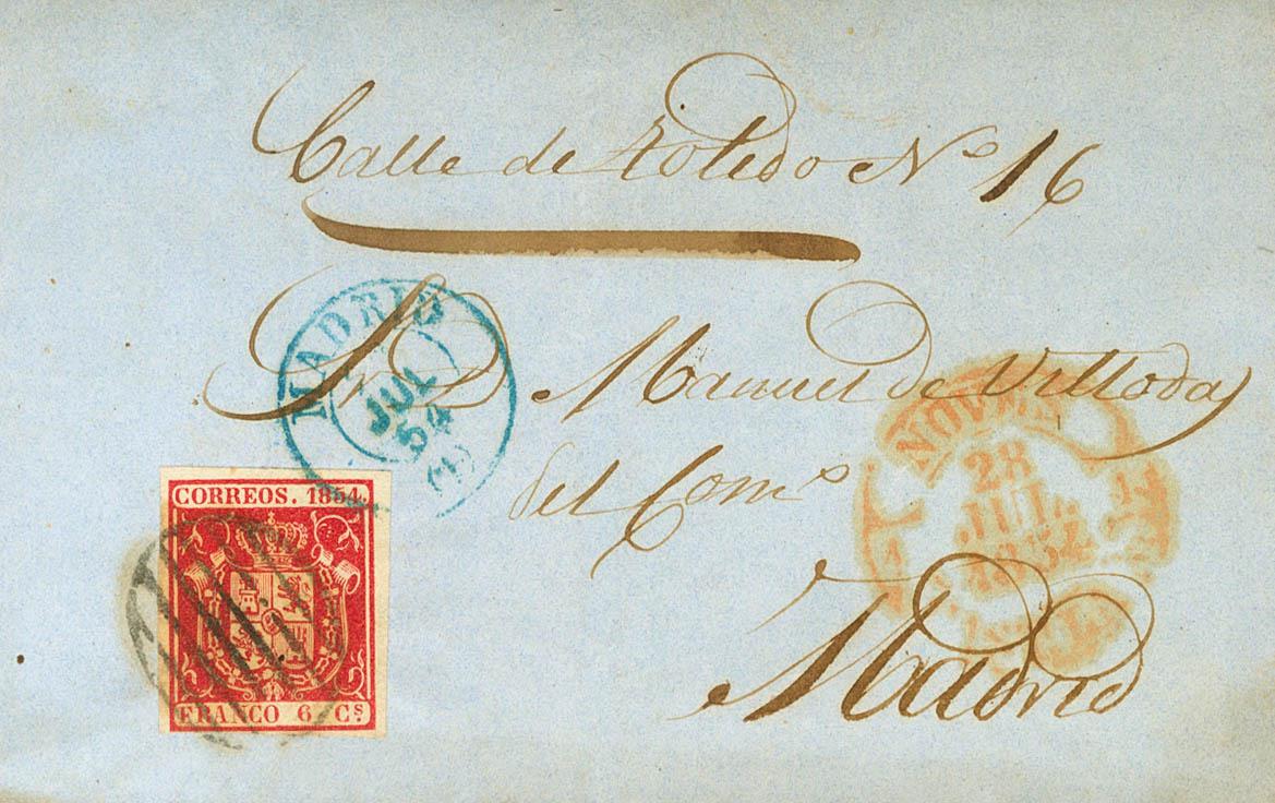 24. 1854. 6 cuartos carmín. NOVES (TOLEDO) a MADRID. Matasello mixto PARRILLA y fechador MADRID / (1), en azul aplicado a la llegada, en el frente baeza NOVES / CAST.LA N, en rojo. MAGNIFICO Y RARO.